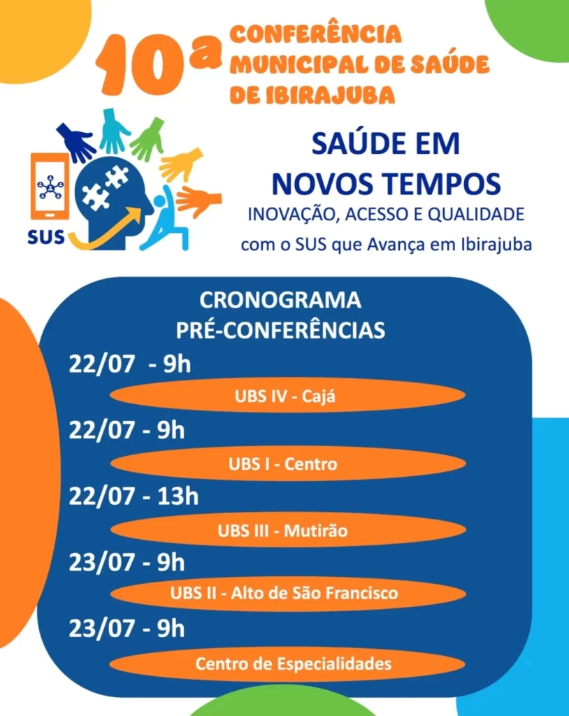 A Prefeitura de Ibirajuba, por meio da Secretaria Municipal de Saúde e em parceria com o Conselho Municipal de Saúde, convida toda a comunidade ibirajubense a participar ativamente das pré-conferências municipais de saúde.