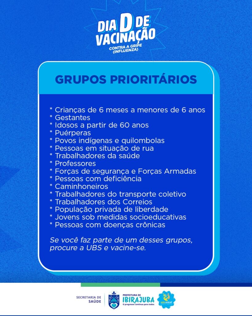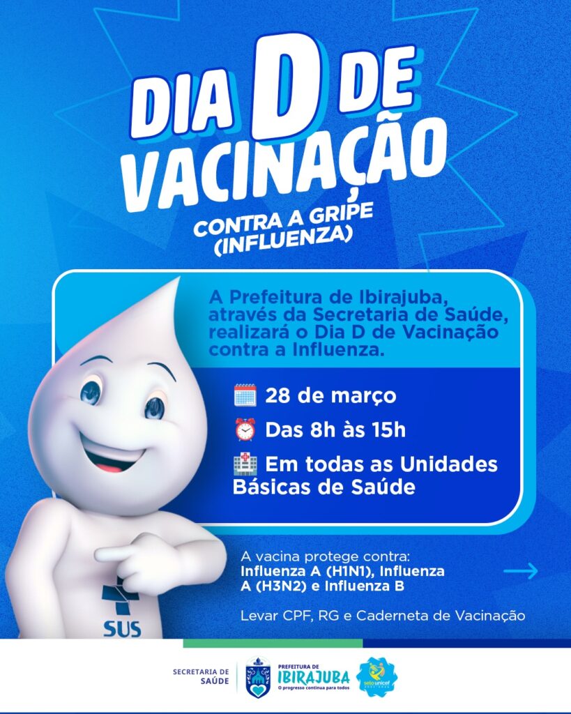 A Prefeitura Municipal de Ibirajuba, por meio da Secretaria de Saúde, realiza o Dia D de Vacinação Nacional contra a Influenza (Gripe) no dia 28 de março, das 8h às 15h, em todas as Unidades Básicas de Saúde do município. A vacina, administrada anualmente para os grupos prioritários definidos pelo Ministério da Saúde, é trivalente e protege contra as cepas Influenza A (H1N1), A (H3N2) e Influenza B, sendo a principal estratégia de prevenção, reduzindo complicações, internações e óbitos durante o período de maior circulação do vírus. Os grupos prioritários devem procurar a UBS mais próxima, levando CPF, RG e caderneta de vacinação. Prepare o braço e venha se proteger!