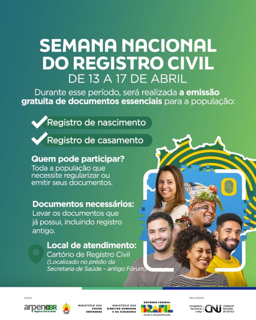 Garantir o direito à cidadania é um compromisso com a nossa gente! De 13 a 17 de abril, acontece a Semana Nacional do Registro Civil, oferecendo a emissão gratuita de documentos essenciais, como registro de nascimento e casamento. Uma oportunidade importante para quem precisa regularizar sua documentação com mais facilidade e acesso. Procure o Cartório de Registro Civil (no prédio da Secretaria de Saúde – antigo Fórum) e aproveite esse serviço. Cuidar das pessoas também é garantir seus direitos.