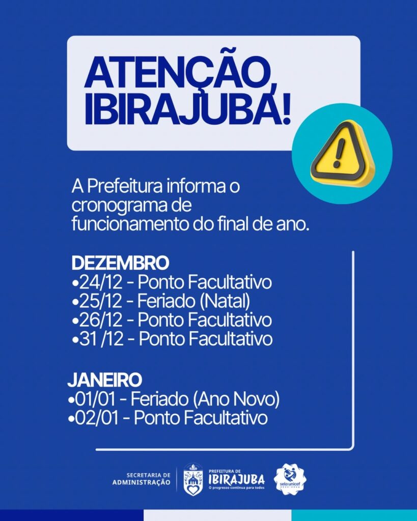 Atenção, servidor e cidadão de Ibirajuba! A Prefeitura Municipal, por meio da Secretaria de Administração, informa o cronograma de funcionamento para este final de ano, com os seguintes feriados e pontos facultativos: em dezembro, dia 24 (ponto facultativo), dia 25 (feriado de Natal), dia 26 (ponto facultativo) e dia 31 (ponto facultativo); em janeiro, dia 1º (feriado de Ano Novo) e dia 2 (ponto facultativo). Aproveitamos para desejar a todos os nossos servidores e amigos um Feliz Natal e um Ano Novo repleto de realizações, paz e saúde. Que 2026 seja um ano de ainda mais progresso para nossa cidade!