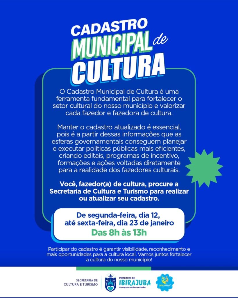 O Cadastro Municipal de Cultura 2026 está aberto! Se você é artista, artesão, músico, produtor cultural, integrante de grupo ou fazedor(a) de cultura, este é o momento de participar do fortalecimento cultural do nosso município. O cadastro é uma ferramenta essencial para que a Prefeitura de Ibirajuba, por meio da Secretaria de Cultura e Turismo, planeje políticas públicas mais eficientes e desenvolva editais, programas de incentivo, formações e ações que realmente atendam às necessidades de quem faz cultura. Período: 12 a 23 de janeiro, Horário: das 8h às 13h, Local: Secretaria de Cultura e Turismo. Cadastrar-se é garantir mais visibilidade, reconhecimento e oportunidades para a cultura local. Vamos juntos fortalecer a cultura de Ibirajuba em 2026!