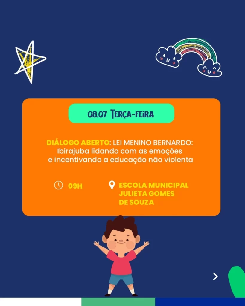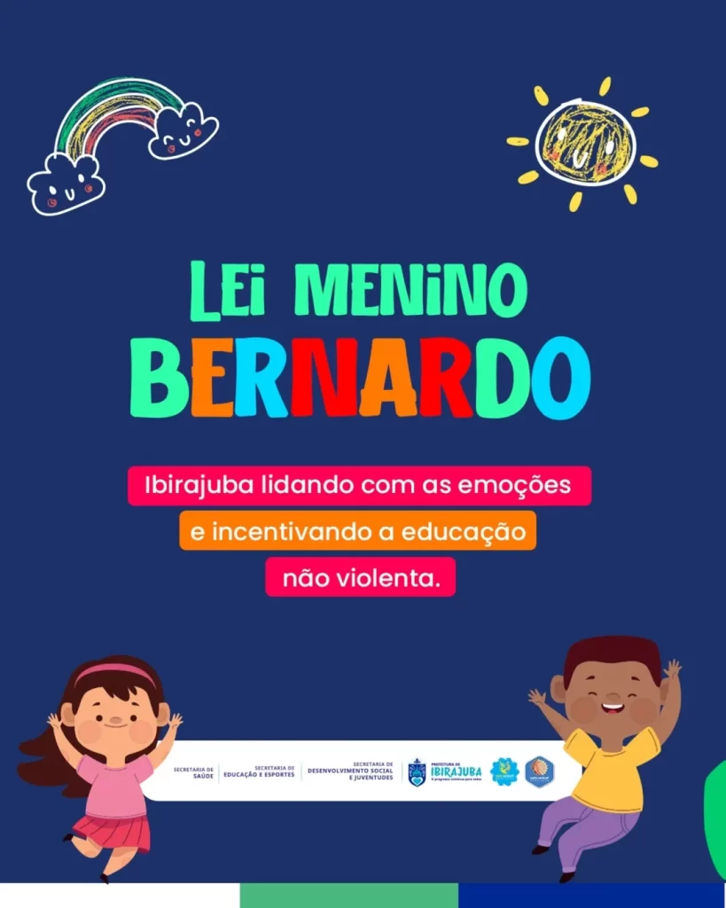 om o tema: “Lei Menino Bernardo: Ibirajuba lidando com as emoções e incentivando a educação não violenta”, nossa cidade se une em uma importante campanha de conscientização sobre os direitos das crianças e adolescentes, fortalecendo o cuidado, o diálogo e o respeito em casa, na escola e na comunidade.