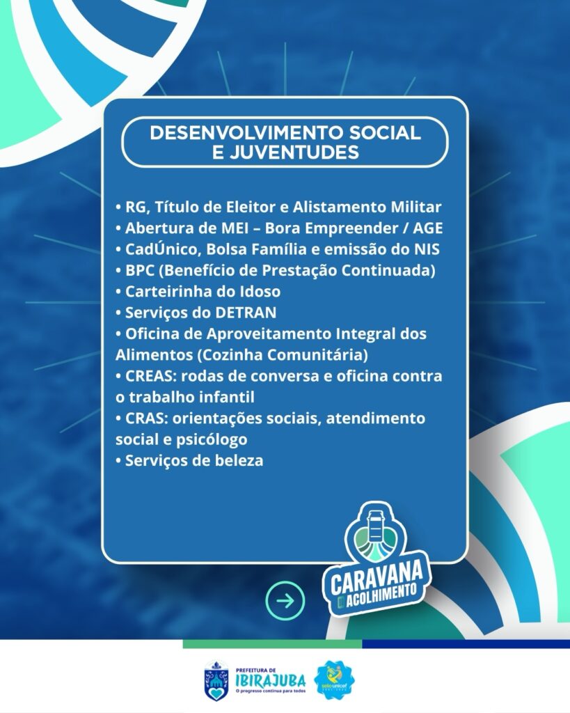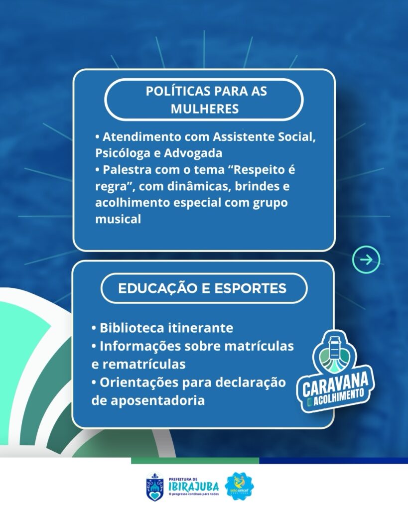 A Caravana do Acolhimento segue levando serviços, cuidado e presença da gestão para mais perto das comunidades rurais. Neste sábado, dia 04, estaremos no Sítio Buqueirão, com atendimentos e orientações nas áreas de saúde, assistência social, educação e políticas para as mulheres. É a Prefeitura de Ibirajuba trabalhando para garantir mais acesso, cidadania e cuidado para quem vive no campo. Participe e convide sua comunidade!