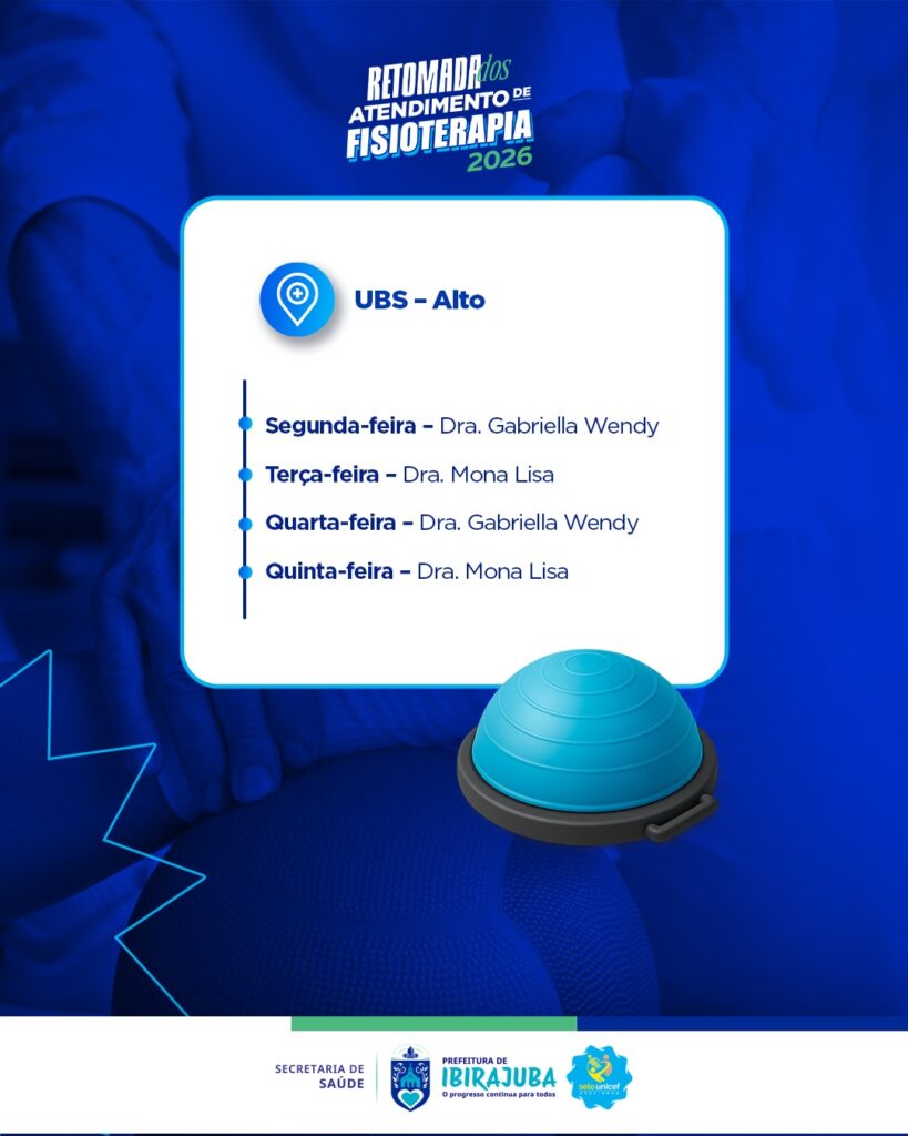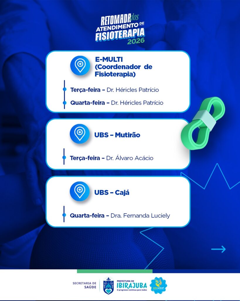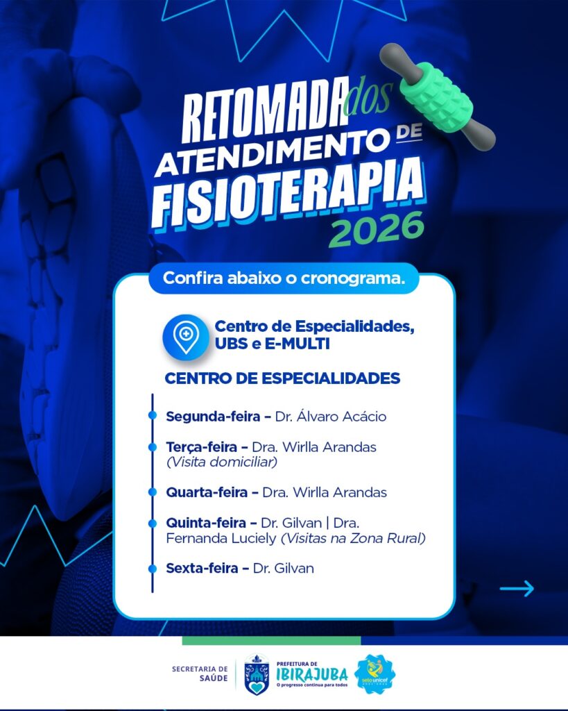 A Prefeitura Municipal, por meio da Secretaria de Saúde, divulga o cronograma de atendimentos de fisioterapia em nosso município, com serviços voltados à reabilitação, promoção da qualidade de vida e bem-estar da população, reforçando o cuidado com a saúde de quem mais precisa; confira as datas, locais e horários no cronograma e, em caso de dúvidas, procure a Secretaria de Saúde.