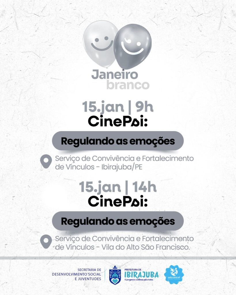 A Prefeitura de Ibirajuba, por meio da Secretaria de Saúde e da Secretaria de Desenvolvimento Social e Juventudes, promove uma programação especial voltada à saúde mental, com ações nas Unidades Básicas de Saúde e atividades do CinePsi – Regulando as Emoções, reforçando o cuidado com o bem-estar da nossa população. As ações acontecerão nos seguintes locais e datas: 14/01 no Centro de Especialidades, 20/01 na UBS Centro, 21/01 na UBS Alto, 27/01 na UBS Mutirão e 28/01 na UBS Cajá.