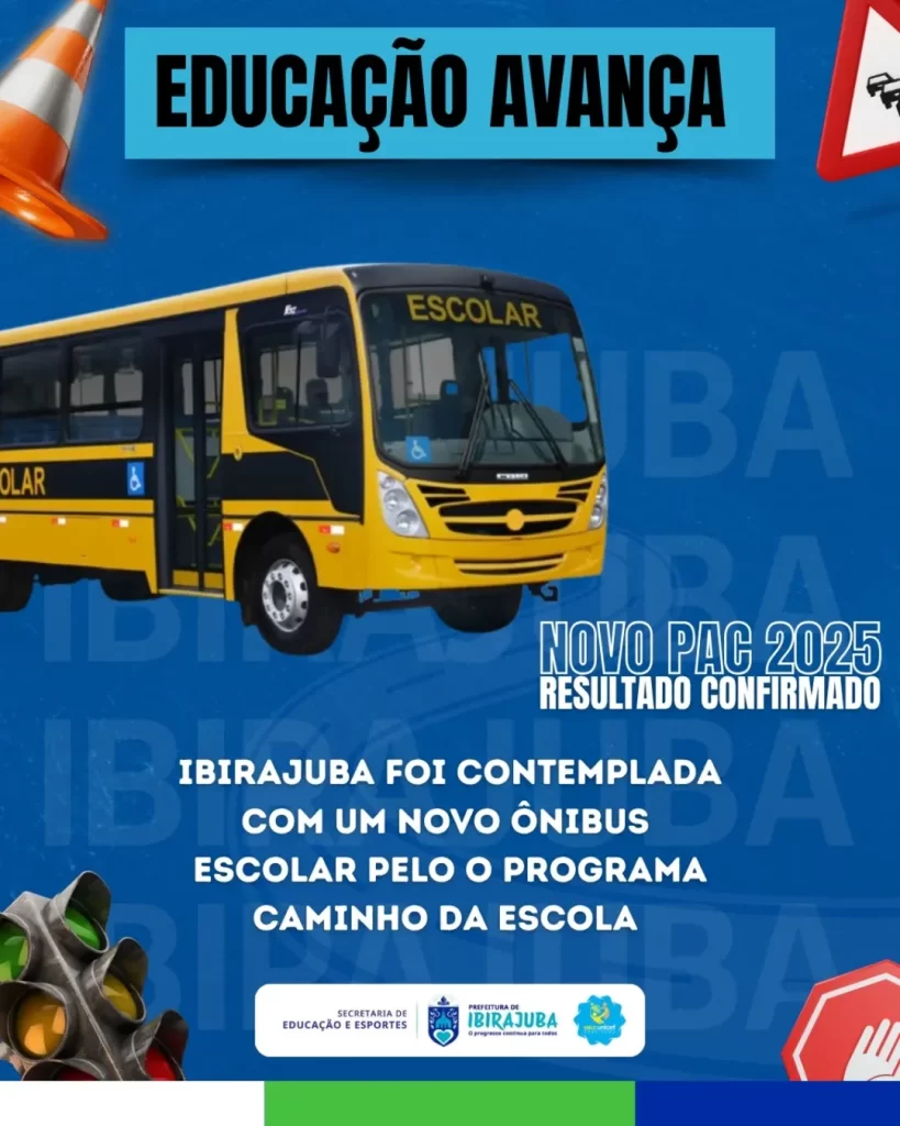 Temos a satisfação de comunicar que o município de IBIRAJUBA–PE foi contemplado com 01 ÔNIBUS ESCOLAR NOVO, por meio do Programa Caminho da Escola, na Seleção do Novo PAC 2025! Esse novo transporte escolar representa mais dignidade, segurança e qualidade para os estudantes, especialmente os que moram na zona rural, fortalecendo o direito à educação para todos.