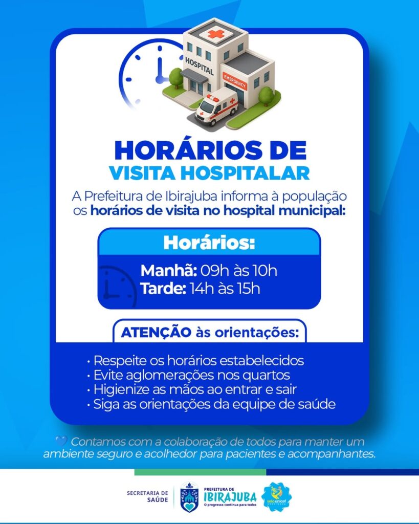 Cuidar de quem a gente ama também é respeitar cada detalhe. A Prefeitura de Ibirajuba informa os horários de visita no hospital municipal, organizados para garantir mais segurança, tranquilidade e qualidade no atendimento aos pacientes: pela manhã, das 09h às 10h, e à tarde, das 14h às 15h. Pedimos a colaboração de todos: respeite os horários, evite aglomerações, higienize as mãos e siga as orientações da equipe de saúde. Juntos, construímos um ambiente mais seguro e acolhedor para todos.