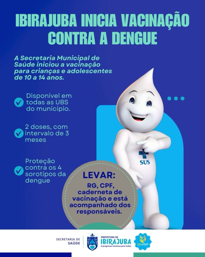 A Secretaria Municipal de Saúde de Ibirajuba, por meio do Programa Nacional de Imunizações (PNI), inicia a vacinação contra a dengue para crianças e adolescentes ibirajubenses de 10 a 14 anos. A dengue é uma doença viral febril grave, uma arbovirose que pode evoluir para casos graves e até óbito, transmitida pela fêmea do mosquito Aedes aegypti, e o imunizante ofertado garante proteção contra os quatro principais sorotipos do vírus (DENV-1, DENV-2, DENV-3 e DENV-4). A vacinação, uma das principais formas de prevenção, acontece em todas as Unidades Básicas de Saúde do município, com esquema de duas doses e intervalo de três meses entre a D1 e a D2. Para se vacinar, é necessário apresentar RG, CPF, Caderneta de Vacinação e estar acompanhado por pais ou responsáveis. A saúde do seu filho e de toda a comunidade é nossa prioridade — vamos juntos nos proteger!