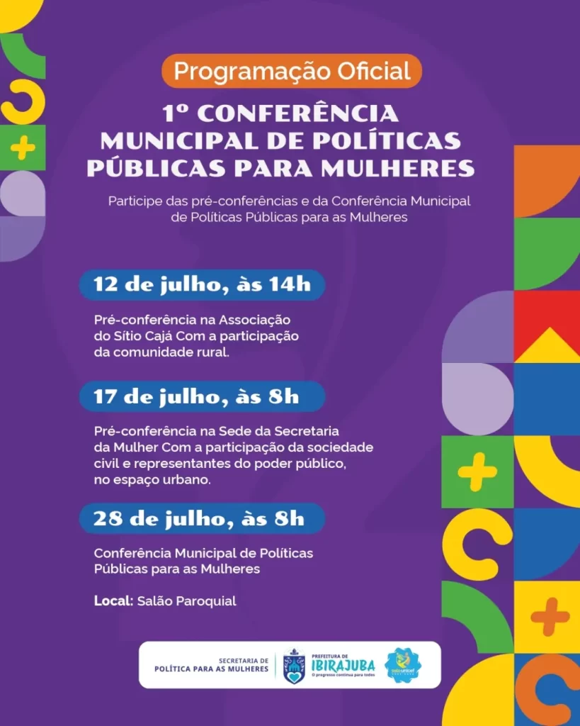 Com o tema “Políticas Públicas e Saúde Mental: escutar, cuidar e garantir direitos”, a Prefeitura convida todas e todos a participarem ativamente das pré-conferências e da Conferência Municipal de Políticas Públicas para as Mulheres. Este é um momento essencial de escuta e construção coletiva de propostas que promovam o bem-estar, o cuidado com a saúde mental e a efetivação dos direitos das mulheres em todas as suas realidades. A programação tem início no dia 12 de julho, às 14h, com a pré-conferência na Associação do Sítio Cajá, voltada especialmente para a participação da comunidade rural.