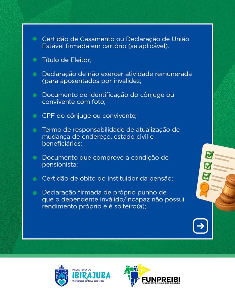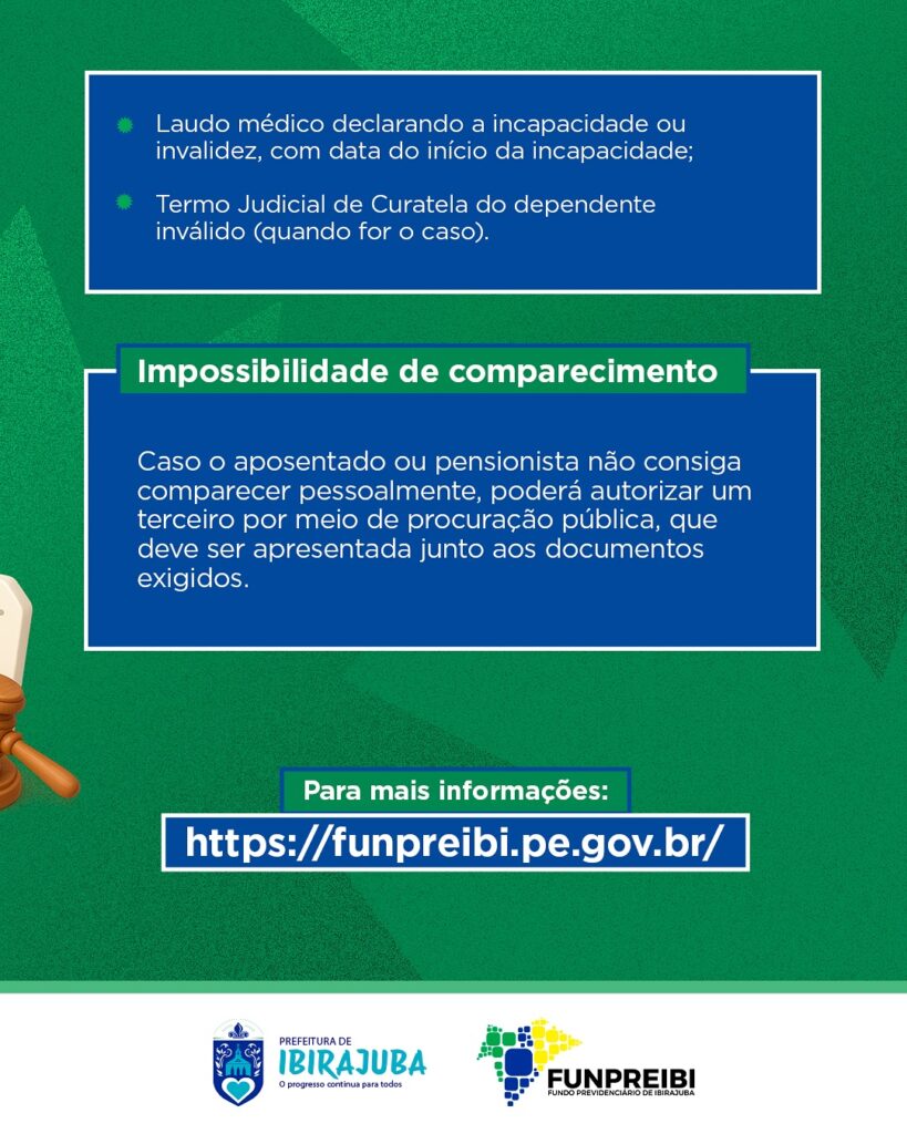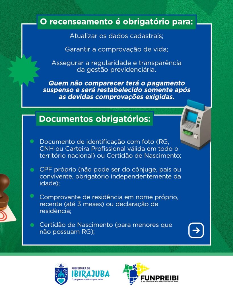 O Fundo Previdenciário do Município de Ibirajuba – FUNPREIBI convoca todos os servidores aposentados e pensionistas vinculados ao Regime Próprio de Previdência Social – RPPS a comparecerem para a realização do Recenseamento Previdenciário Obrigatório, destinado à atualização cadastral, comprovação de vida e à garantia da regularidade e transparência na gestão previdenciária. Local: Avenida Tenente Xavier de Araújo, nº 45 – Sede do FUNPREIBI
