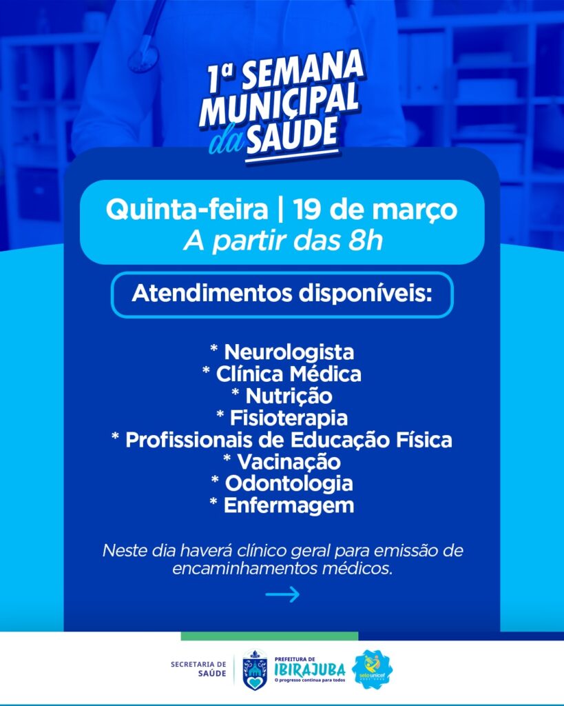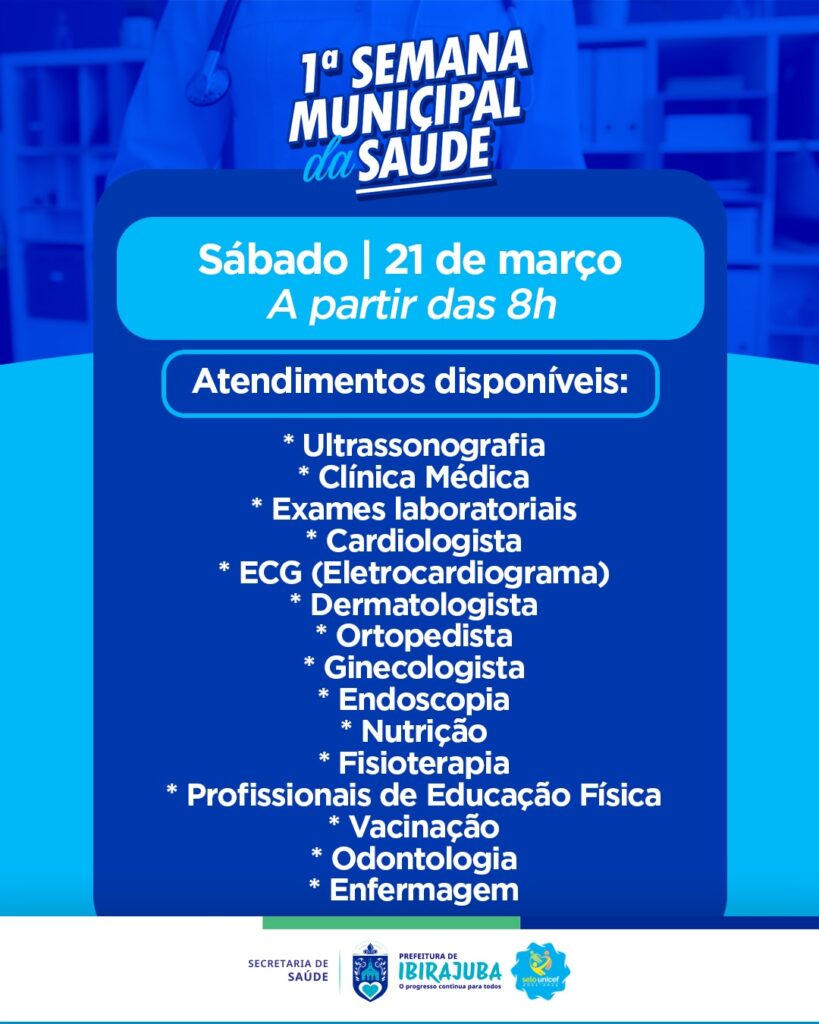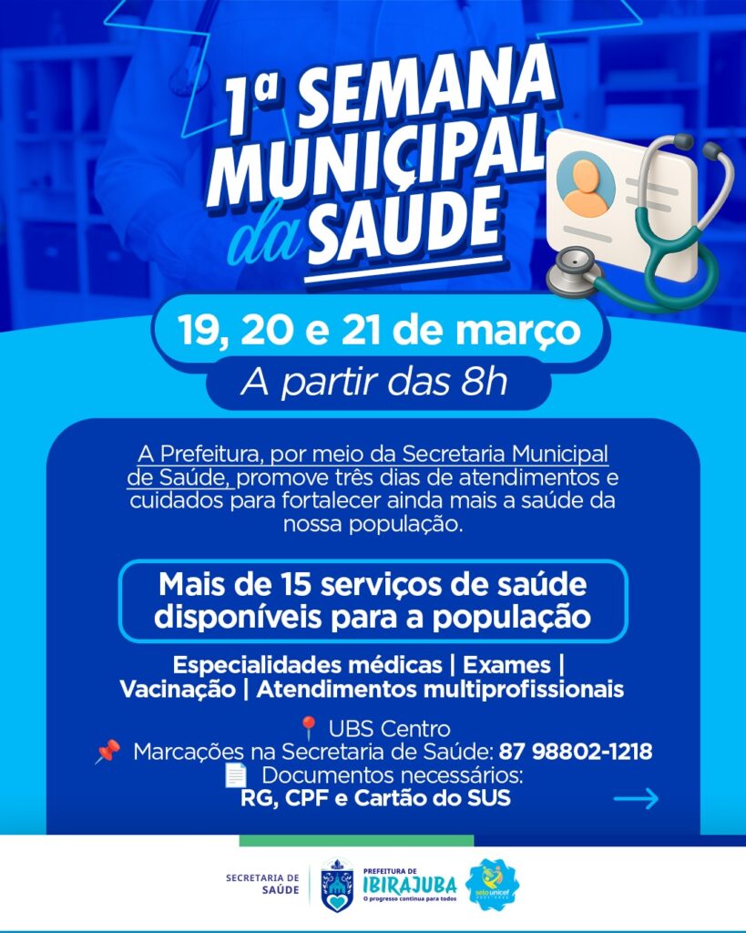 A Prefeitura, por meio da Secretaria Municipal de Saúde, realizará a Semana Municipal da Saúde, uma grande ação voltada ao cuidado e ao fortalecimento da saúde da nossa população. Serão três dias de atendimentos com diversos serviços e especialidades, garantindo mais acesso à saúde e ampliando o cuidado com quem mais precisa. A programação acontece nos dias 19, 20 e 21 de março, a partir das 8h, na UBS Centro. As marcações podem ser feitas na Secretaria Municipal de Saúde ou por meio da Regulação, pelo número (87) 8802-1218. Para atendimento, é necessário apresentar RG, CPF e Cartão do SUS.