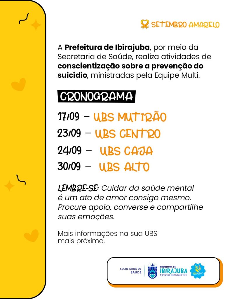 Durante todo o mês, nossas UBS estarão realizando ações especiais de conscientização sobre saúde mental e prevenção do suicídio, com a participação da Equipe Multi. O cronograma inclui atividades no dia 17 de setembro na UBS Mutirão, 23 de setembro na UBS Centro, 24 de setembro na UBS Cajá e 30 de setembro na UBS Alto. Sua presença faz a diferença: vamos juntos cuidar da vida e espalhar esperança!