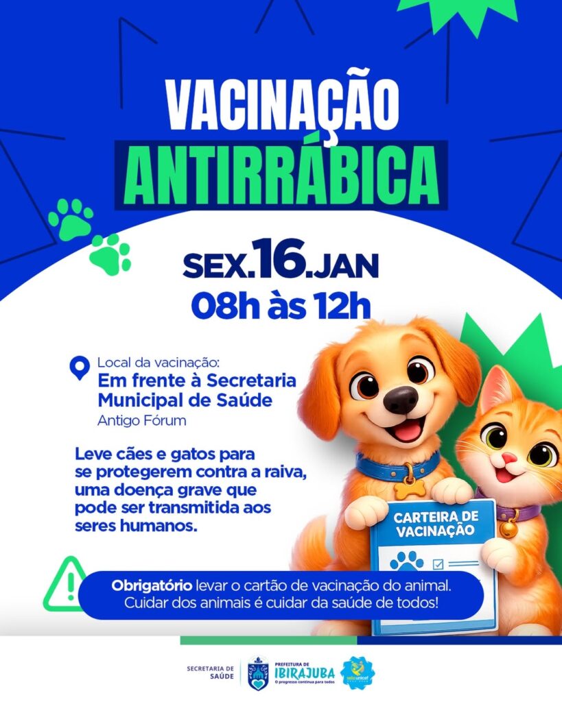 Nesta sexta-feira, 16 de janeiro, das 8h às 12h, acontece a Vacinação Antirrábica em frente à Secretaria Municipal de Saúde (antigo Fórum). Leve seu cão ou gato para garantir a proteção contra a raiva, uma doença grave que também pode afetar humanos, e não esqueça de levar a carteira de vacinação do seu animal. Cuidar dos nossos pets é cuidar da saúde de toda a cidade!