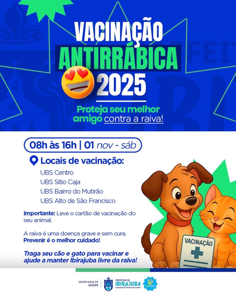 No dia 01 de novembro, das 08h às 16h, tem Vacinação Antirrábica em todas as UBS: Centro, Sítio Caja, Bairro do Mutirão e Alto de São Francisco. Traga seu cão ou gato e leve o cartão de vacina.