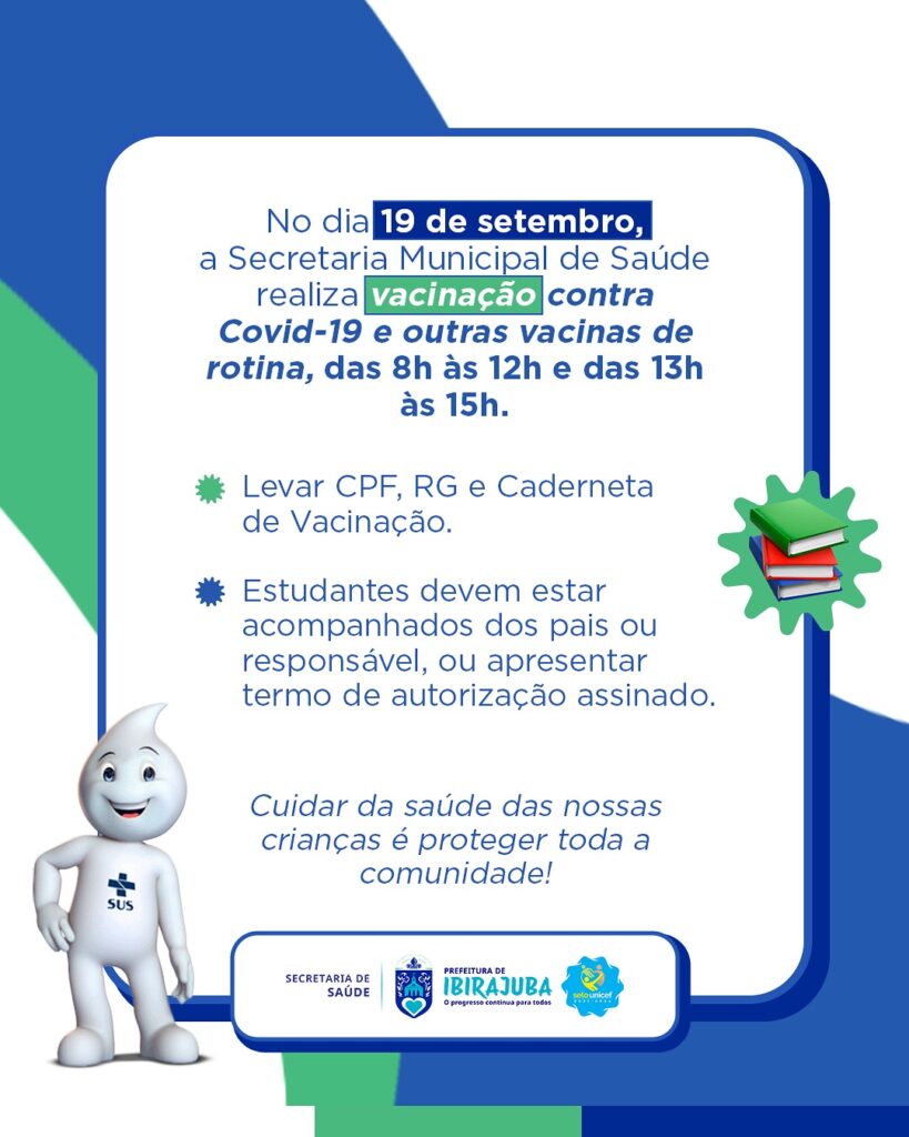 A Secretária Municipal de Saúde de Ibirajuba, por meio do Programa Nacional de Imunização (PNI), realizará neste dia 19 de setembro, vacinação na Escola Dom João da Mata do Amaral. A vacinação acontecerá das 8h às 12h e das 13h às 15h. Estaremos vacinando contra Covid e outras vacinas de rotina. É necessário trazer: CPF, RG e Caderneta de Vacinação, estar acompanhado pelos pais ou responsável, ou trazer o termo de autorização assinado pelos mesmo. A saúde do seu filho e de toda comunidade é nossa prioridade. Vamos juntos nos proteger!